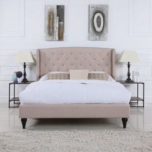 - Classic and sophisticated bed frame with tufted shelter style headboard in a rich beige color